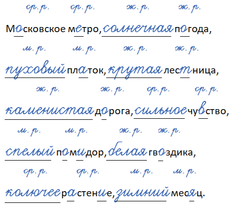 Московское (ср. р.) метро (ср. р.), ветреная (ж. р.) погода (ж. р.)расписной (м. р.) платок (м. р.), каменная (ж. р.) лестница (ж. р.)дальняя (ж. р.) дорога (ж. р.), сильное (ср. р.) чувство (ср. р.)желтый (м. р.) помидор (м. р.), белая (ж. р.) гвоздика (ж. р.)колючее (ср. р.) растение (ср. р.), яркий (м. р.) месяц (м. р.).