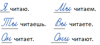 Я - 1 лицо, ед. ч.; мы - 1 лицо, мн. ч.; ты - 2 лицо, ед. ч.; вы - 2 лицо, мн. ч.; он - 3 лмцо, ед. ч.; они - 3 лицо, мн. ч.