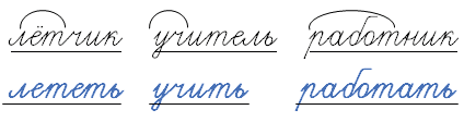 Например: летчик - летать, полёт; учитель - учить, учебный; работник - работать, работа.