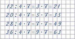 | 12 : 4 • 7 = 21 20 : 4 • 7 = 35 | 28 : 4 • 7 = 49 36 : 4 • 7 = 63 |
