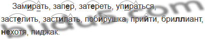 Зам..рать, зап..р, зат..реть, уп..раться, заст..лить заст..лать, поб..рушка, при..ти, брил(?)иант, (не)хотя пиджак.