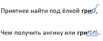 Гриб [гр'ип], грипп [гр'ип]; слова пишутся по-разному, а произносятся одинаково. Значения слов также различны: гриб - низшее растение, размножающееся спорами; грипп - заболевание.