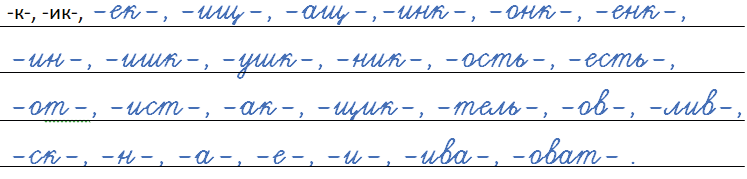 -к-, -ик-, -ек-, -ищ-, -инк-, -онк-, -енк-, -ин-, -ишк-, -ушк-, -ник-, -ость-, -есть-, -от-, -ист-, -ак-, -щик-, -тель-, -ов-, -лив-, -ск-, -н-, -а-, -е-, -и-, -ива-, -оват- .