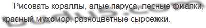 Рисовать корал..ы, алые п..руса, лесные ф..алки, красный мух..мор, разноцветные сырое..ки.