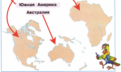1. Наш любознательный попугай предлагает задание. Используя карту учебника, узнай материки по силуэтам. Укажи стрелками их названия.
