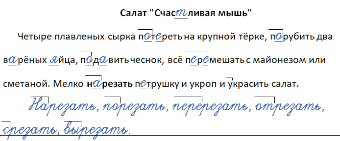 Вставим пропущенные буквы: счастливая - счастье (непроизносимая согласная), потереть - тёрка (безударная гласная), порубить, варёных - ва́рит, яйца - я́йца, подавить - да́вка, перемешать - ме́сит, нарезать, петрушку - словарное слово.