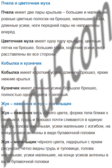 Сравни пчелу и цветочную муху; кобылку и кузнечика; жука – навозника и жука – могильщика. Выдели признаки, по которым их можно различить в природе (ответь устно).