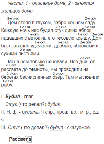 Дом ст..ял (в)глухом, заброшенном саду каждую ночь нас будил3 стук диких яблок, падавших с веток на его т..совую крышу дом был завален удочками, дробью, яблоками и сухими листьями мы в нём только н..чевали все дни, от рассвета2 до т..мноты, мы проводили на б..регах бесчисленных озёр там мы л..вили рыбу.