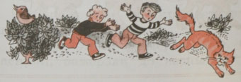 У дома растут густые кусты серая птица села на ветку рыжий кот крадётся к птичке Серёжа и Павлик прогнали кота.
